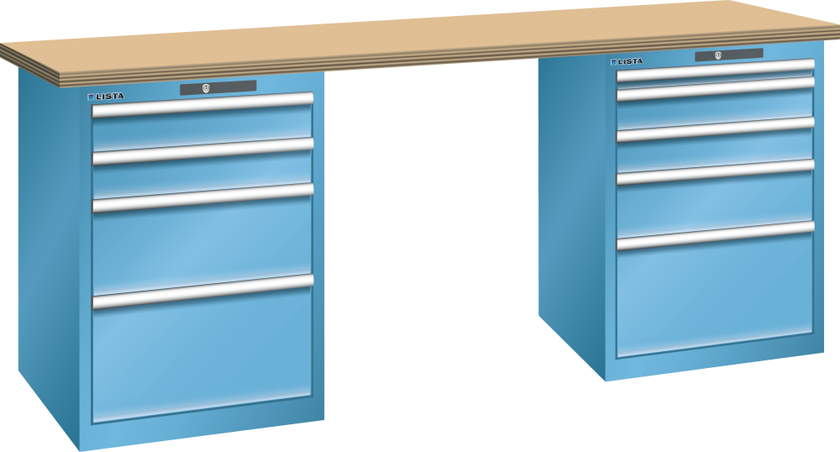 Workbench 27x36E (WxDxH) 2000x800x850mm 4 + 5 drawers (left: 2x100/1x200/1x300, right: 1x50/2x100/1x150/1x300) 75kg beech KEY Lock Light blue RAL 5012