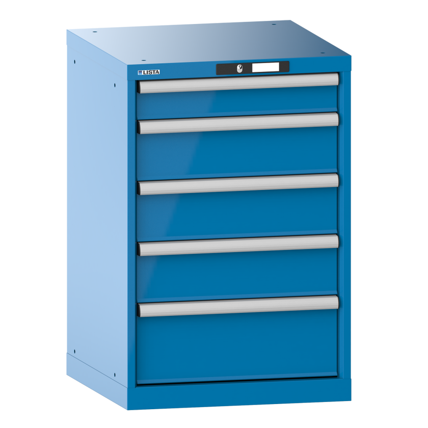 Drawer cabinet 27x27E (WxDxH) 564x572x850mm 5 drawers (1x100/3x150/1x200) 75kg KEY Lock Light blue RAL 5012