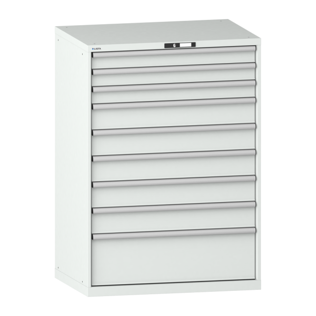 Drawer cabinet 54x36E (WxDxH) 1023x725x1450mm 9 drawers (3x100/5x150/1x300**) 75/**200kg KEY Lock Light grey RAL 7035
